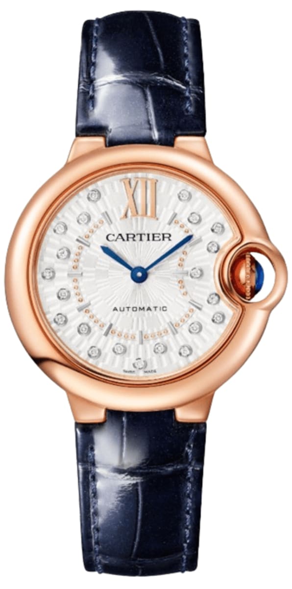Cartier Ballon Bleu de Cartier Automatic Silver Dial 18K Rose Gold Blue Leather Strap Women’s Watch WGBB0052 33mm