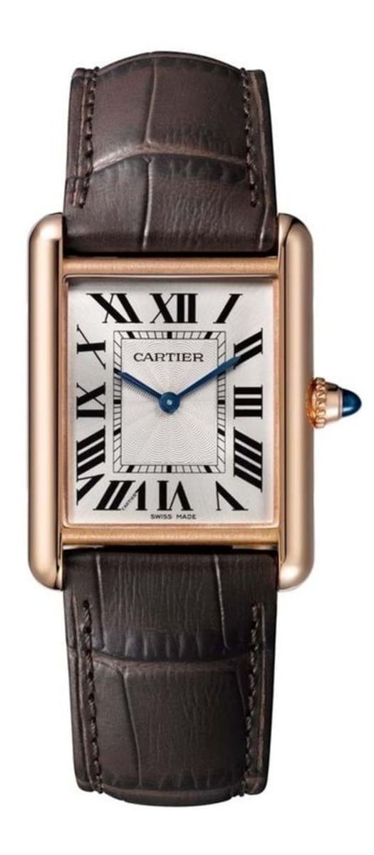Brand New Cartier Tank Louis Hand Wound Women’s Luxury Watch Model WGTA0011. 18kt Rose Gold case with Brown Alligator Leather strap. Fixed bezel. Dial description: Blue Steeled hands and Black Roman Numeral Hour Markers on a Silver Dial. Hand Wound movement. Powered by Cartier Calibre 8971 MC engine. Watch functions: Hour, Minute. Pull and Push Set With a Sapphire Cabochon crown. Mineral crystal. Square case shape. Case size: 33.7mm x 25.5mm. Case thickness: 6.6mm. Solid case back. 30 Meters – 100 Feet water resistant. Also known as model: WGTA0011.