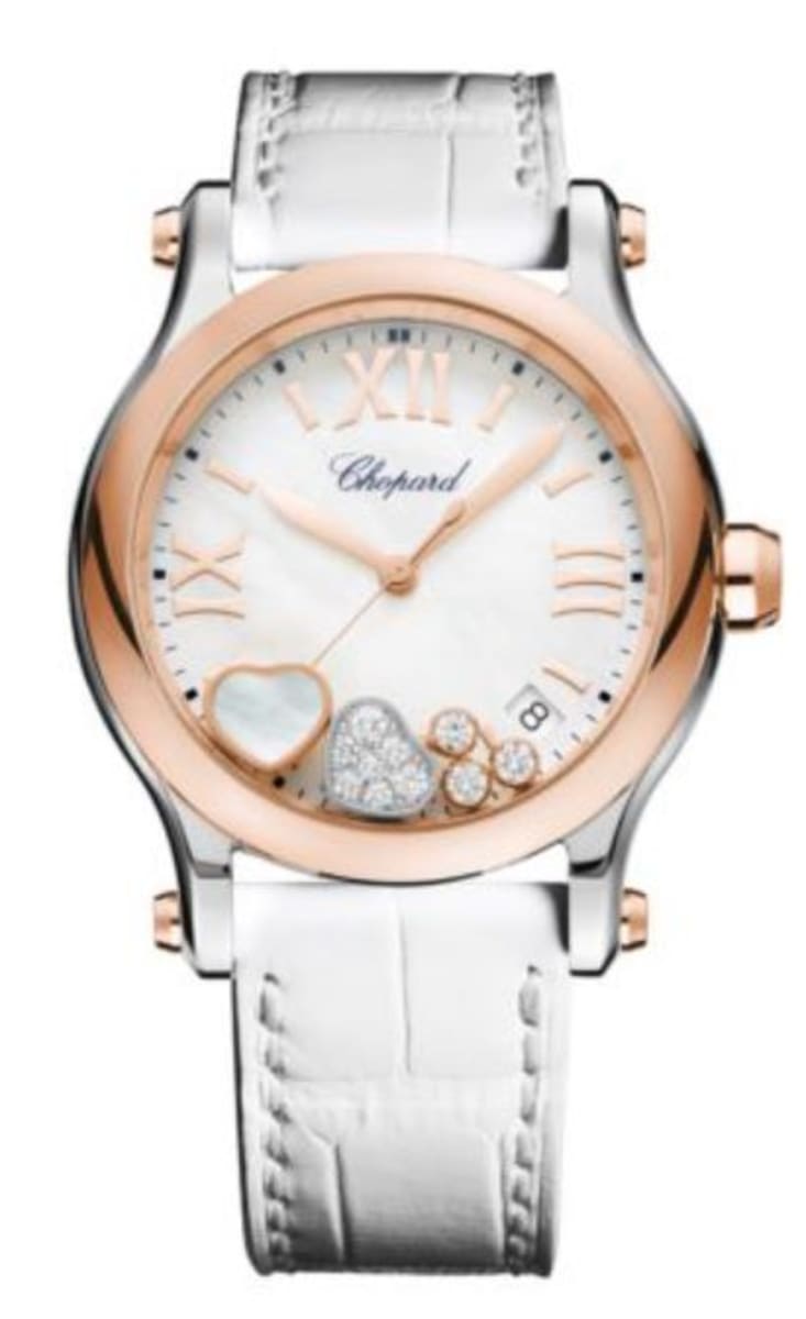 Brand New Chopard Happy Hearts Mother of Pearl Dial Leather Strap Women’s Luxury Watch Model 278582-6009. 18kt Rose Gold and Stainless Steel case with White Alligator Leather strap. Tang clasp. Fixed bezel. Dial description: Rose Gold Hands and Roman Numeral/Index Hour Markers and the Date Displayed between the 4 and 5 o’clock position and Floating Diamonds on a Mother of Pearl dial. Quartz movement. Watch functions: Date, Hour, Minute, Second. Set with Sapphire crown. Scratch Resistant Sapphire crystal. Round case shape. Case size: 36mm. Case thickness: 10.46mm. Solid case back. 30 Meters – 100 Feet water resistant. Also known as model: 2785826009.