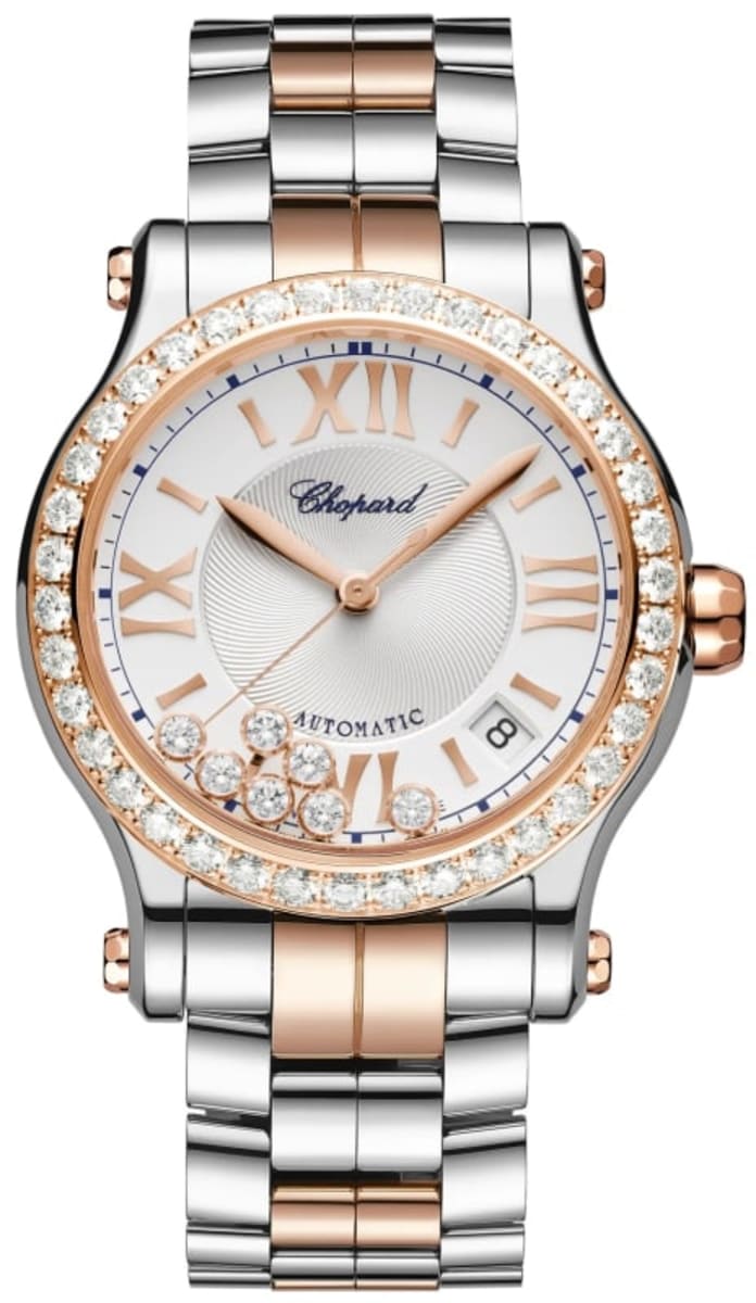 Brand New Chopard Happy Sport Medium Automatic 36mm Silver Dial Diamond Steel Women’s Watch Model 278559-6025. Rose Gold and Stainless Steel case with Rose Gold tone and Silver tone Stainless Steel watch band. Fixed with Diamonds bezel. Dial description: Rose Gold tone hands and Roman Numeral/Index hour markers with minute markers around the outer rim and 7 Floating Diamonds on a Silver dial. Automatic Self Winding movement. 62 hours power reserve. Watch functions: Date, Hour, Minute, Second, Power Reserve. Scratch Resistant Sapphire crystal. Round case shape. Case size: 36mm. Case thickness: 12.15mm. Transparent case back (for illustration purposes only). 30 Meters – 100 Feet water resistant. Also known as model: 2785596025.