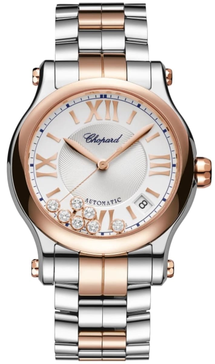 Brand New Chopard Happy Sport Medium Automatic 36mm Silver Dial Steel Women’s Watch Model 278559-6026. Stainless Steel and Rose Gold case with Rose Gold tone and Silver tone Stainless Steel watch band. Folding clasp. Fixed bezel. Dial description: Rose Gold tone hands and Roman Numeral/Index Hour Markers with minute markers around the outer rim and 7 floating diamonds on a Silver dial. Automatic Self Winding movement. 62 hours power reserve. Watch functions: Date, Hour, Minute, Second, Power Reserve. Scratch Resistant Sapphire crystal. Round case shape. Case size: 36mm. Case thickness: 12.15mm. Transparent case back (for illustration purposes only). 30 Meters – 100 Feet water resistant. Also known as model: 2785596026.