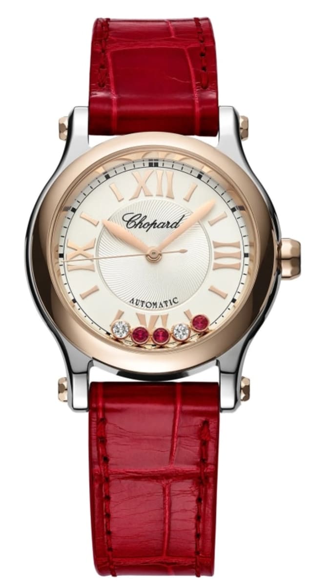 Brand New Chopard Happy Sport Silver Dial Leather Strap Women’s Watch Model 278573-6026. Stainless Steel and Rose Gold case with Red Alligator Leather strap. Tang clasp. Fixed bezel. Dial description: Rose Gold Tone Hands and Index/Roman Numeral Hour Markers with the Minute Markers around the outer rim on a Silver dial. Automatic movement. Powered by Chopard 09.01-C engine with 42 hours power reserve. Watch functions: Hour, Minute, Second. Scratch Resistant Sapphire crystal. Round case shape. Case size: 30mm. Transparent case back (for illustration purposes only). 30 Meters – 100 Feet water resistant. Also known as model: 2785736026.