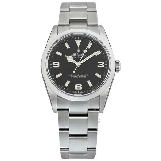 Brand New Silver-tone stainless steel case with a silver-tone stainless steel rolex oyster bracelet. Fixed domed silver-tone stainless steel bezel. Black dial with silver-tone Mercedes-logo, sword, and Breguet-style shape hands and index hour markers. Arabic numerals mark the 3, 6, and 9 o’clock positions. minute markers around the outer rim. Dial Type: Analog. Luminescent hands and dial markers. Rolex Calibre 3130 automatic movement with a 48-hour power reserve. Scratch resistant sapphire crystal. Screw down crown. Solid case back. Round case shape. Case size: 36 mm. Oysterlock clasp. Water resistant at 100 meters / 330 feet. Functions: hour, minute, second, chronometer. Luxury watch style. Watch label: Swiss Made. Item Variations: 114270, 114270-BKAO, Rolex-114270, Rolex-114270-BKAO. Rolex Explorer Black Dial Stainless Steel Oyster Bracelet Automatic Men’s Watch 114270BKAO.