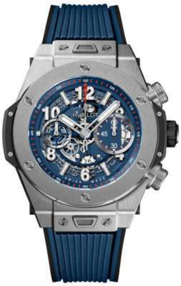Brand New Hublot Big Bang Unico Skeleton Dial Rubber Strap Men’s Watch Model 441.NX.5179.RX. Polished Grey Titanium case with Blue Lined Rubber strap. Deployment with Push Button clasp. Fixed bezel. Dial description: Silver tone hands and Arabic Numeral/Index hour markers with minute markers around the inner rim with 2 sub-dials on a Skeleton dial. Automatic-Chronograph movement. Calendar: Date at 3 o’clock. Chronograph sub-dials display: 60 Second, 30 Minute. Powered by Hublot Calibre HUB1242 engine with 72 hours power reserve. Watch functions: Date, Power Reserve, Hour, Minute, Second, Chronograph. Screw Down crown. Scratch Resistant Sapphire crystal. Round case shape. Case size: 45mm. Transparent case back (for illustration purposes only). 100 Meters – 330 Feet water resistant. Also known as model: 441NX5179RX.