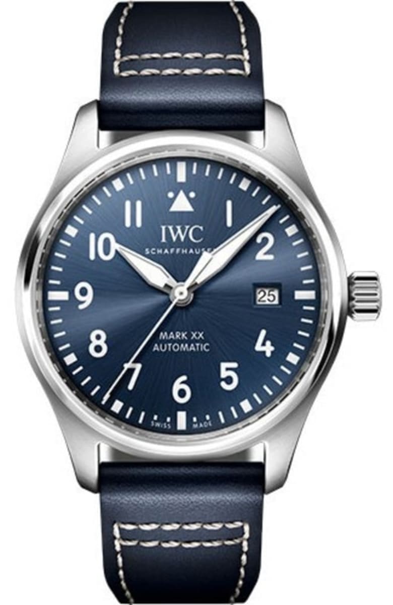 Brand New IWC Pilot’s Mark XX Automatic Blue Dial Leather Strap Men’s Fashion Watch Model IW328203. Brushed and Polished Stainless Steel. case with Blue Calfskin Leather Strap. strap. Tang clasp. Smooth bezel. Dial description: Luminous Silver Hands and Arabic Hour Markers with Minute Markers Around the Outer Rim and the Date at 3 o’clock on a Blue Dial. dial. Swiss Automatic movement. Calendar: Date at 3 o’clock. Chronograph sub-dials display: Date. Powered by Calibre 32111 engine with 120 hours power reserve. Watch functions: Date, Power Reserve, Hour, Minute, Second. Scratch Resistant Sapphire crystal. Round case shape. Case size: 40mm. Case thickness: 10.8mm. Solid case back. 100 Meters – 330 Feet water resistant.
