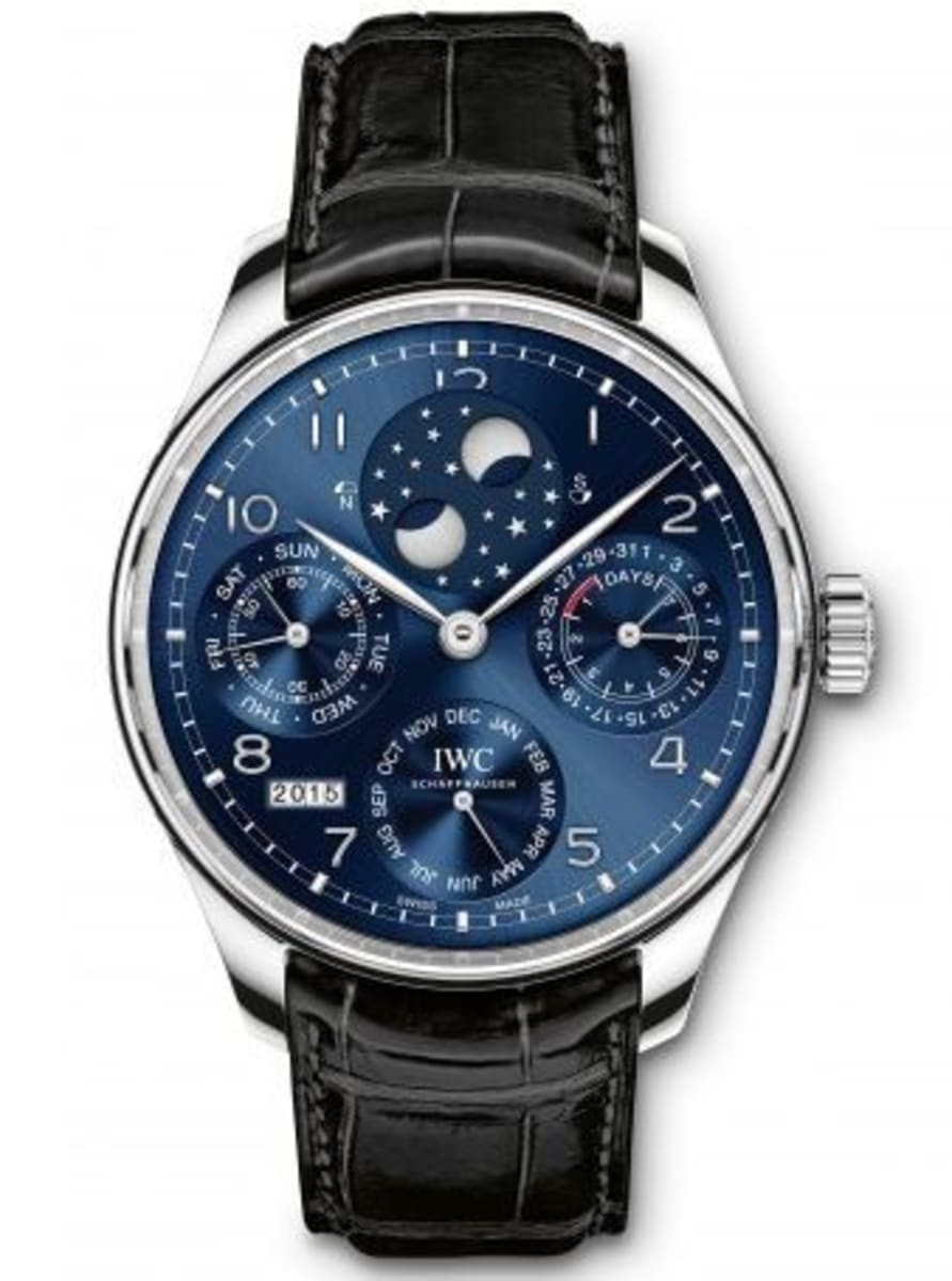 Brand New IWC Portugieser Perpetual Calendar Men’s Watch Model IW503401. 18kt White Gold case with Black Alligator Leather strap. Tang clasp. Fixed bezel. Blue dial. Pellaton Automatic Winding 7-Day Power Reserve movement. Screw Down crown. Scratch Resistant Sapphire crystal. Case size: 44mm. Case thickness: 15.3mm. Transparent case back (for illustration purposes only). 30 Meters – 100 Feet water resistant. Also known as model: IW5034-01, 5034-01, 503401, IW5034.01.