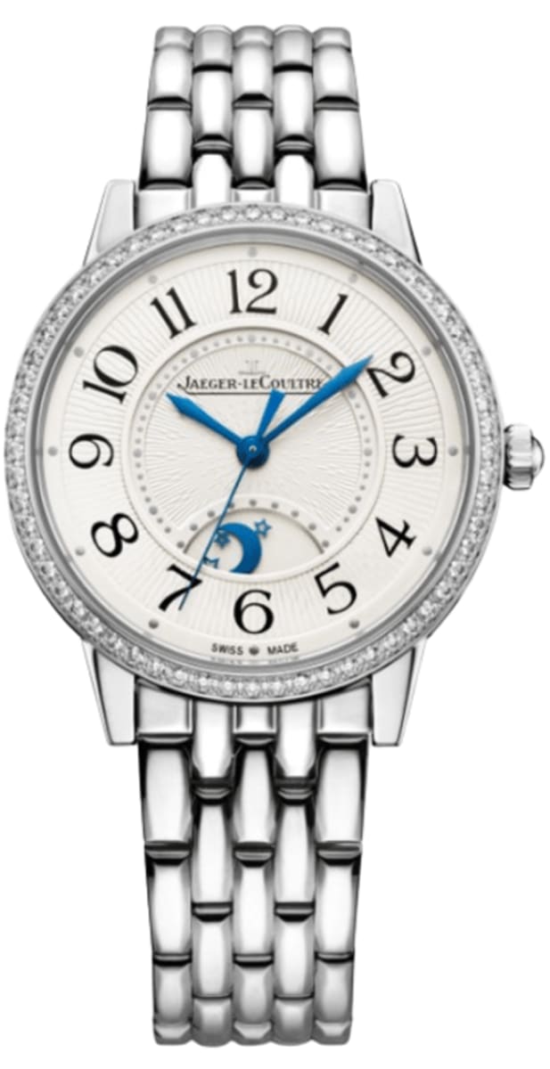 Brand New Jaeger LeCoultre Rendez-Vous Night & Day 34mm Automatic Grey Dial Diamond Bezel Steel Women’s Luxury Watch Model Q3448130. Polished Stainless Steel case with Polished Stainless Steel Bracelet watch band. Polished Stainless Steel Folding clasp. Fixed. Diamond Set bezel. Dial description: Polished Blue Hands with Arabic Numeral Hour Markers on a Silvered Grey Dial. Swiss Automatic movement. Powered by Calibre 898A engine with 38 hours power reserve. Watch functions: Hour, Minute, Second, Power Reserve, Day-Night Indicator. Pull/Push crown. Scratch Resistant Sapphire crystal. Round case shape. Case size: 34mm. Transparent case back (for illustration purposes only). 30 Meters – 100 Feet water resistant. Diamond Set Bezel, 0.63 cts Also known as model: 3448130.