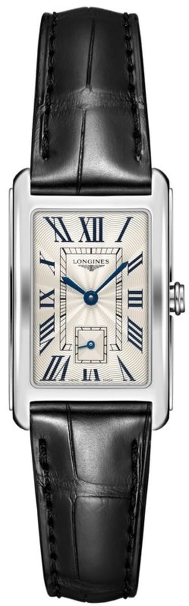 Brand New Longines DolceVita Silver Dial Black Leather Strap Women’s Watch Model L5.512.4.71.0. Stainless Steel case with Black Alligator Leather strap. Tang clasp. Fixed bezel. Dial description: Blue Steel hands and Roman Numeral hour markers with minute markers around the inner rim and a small seconds sub-dial on a Silver Flinque dial. Quartz movement. Chronograph sub-dials display: Small Seconds. Powered by Longines Caliber L176 engine. Watch functions: Hour, Minute, Second. Push In crown. Scratch Resistant Sapphire crystal. Rectangle case shape. Case size: 37mm x 23.3mm. Solid case back. 30 Meters – 100 Feet water resistant. Also known as model: L55124710.
