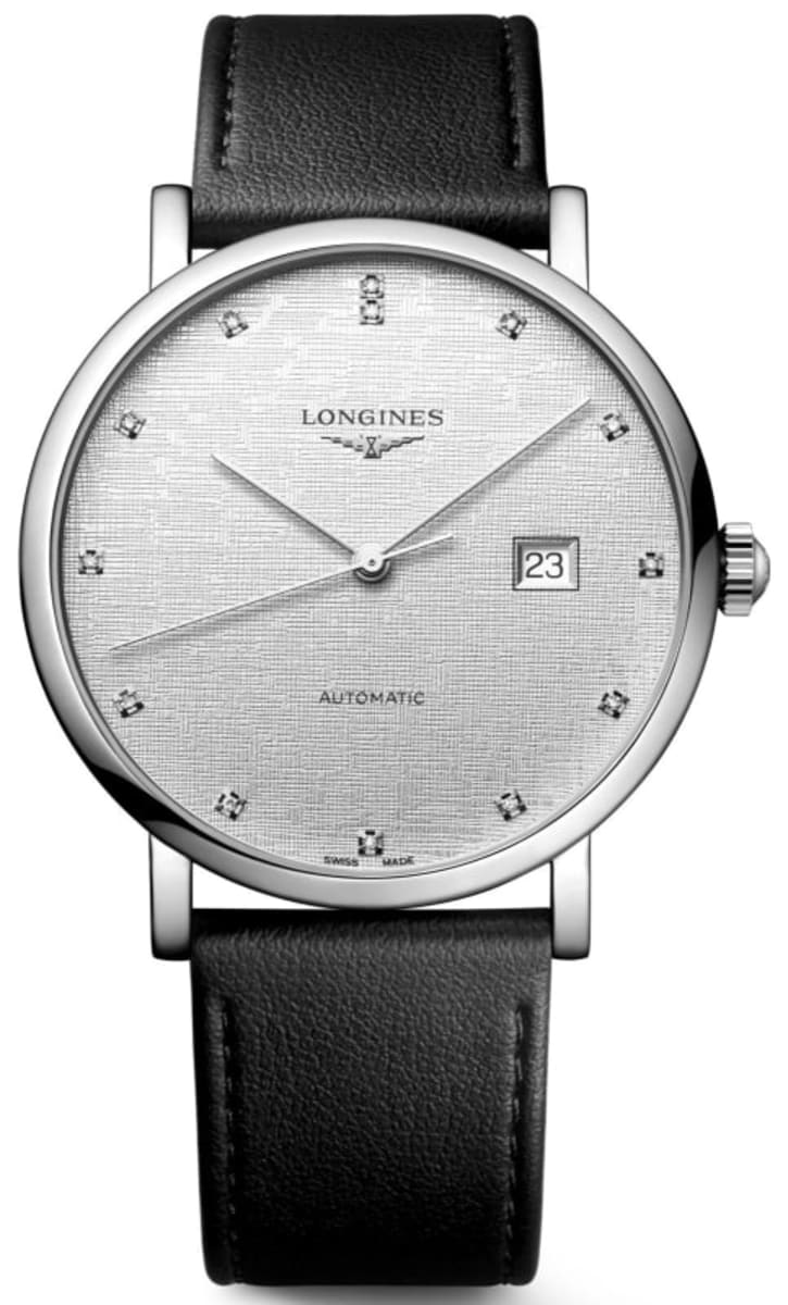 Brand New Longines Elegant Collection Silver Dial Leather Strap Women’s Watch Model L4.911.4.77.2. Stainless Steel case with Black Vegetable Material strap. Tang clasp. Dial description: Silver tone hands and Diamond hour markers on a Striped Silver dial. Automatic movement. Powered by Longines Caliber L888 engine with 72 hours power reserve. Watch functions: Date, Hour, Minute, Second, Power Reserve. Scratch Resistant Sapphire crystal. Round case shape. Case size: 41mm. Case thickness: 9.40mm. Transparent case back (for illustration purposes only). 30 Meters – 100 Feet water resistant. Also known as model: L49114772.