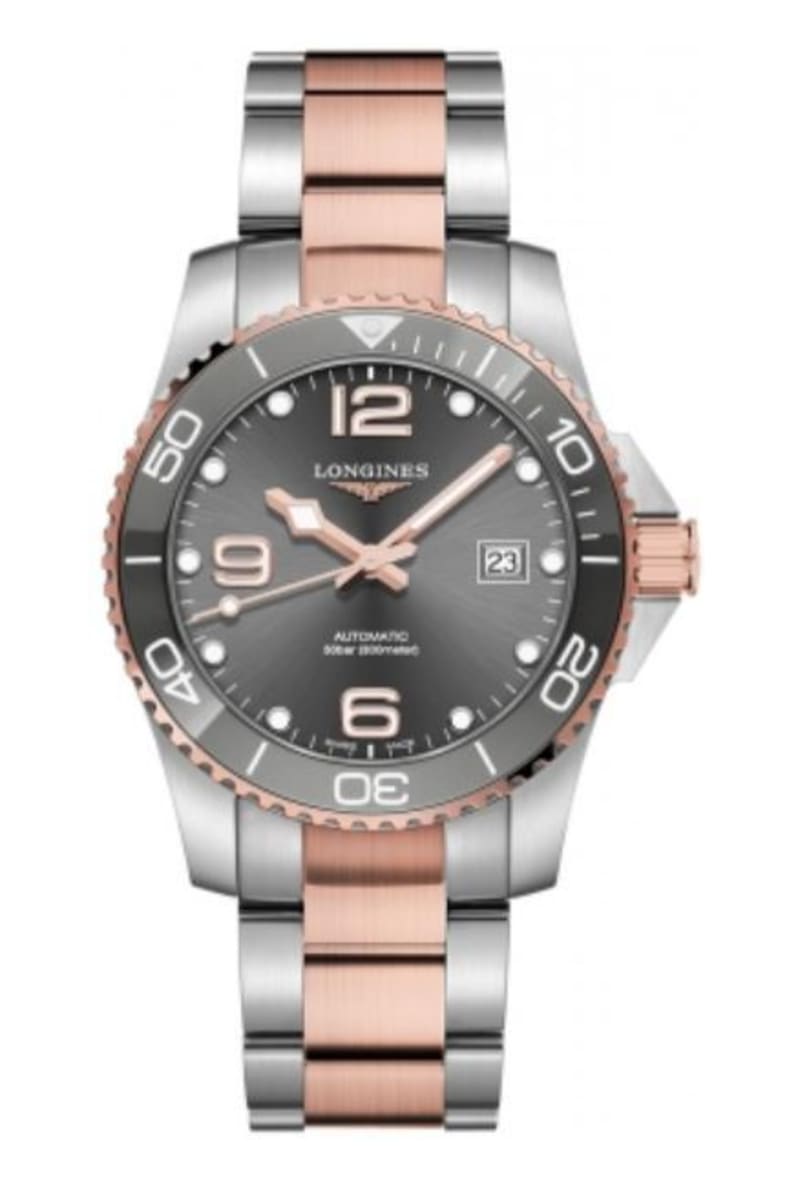 Brand New Longines HydroConquest Automatic Grey Dial Steel Men’s Watch Model L3.781.3.78.7. Rose Gold & Stainless Steel case with Two-Tone Rose Gold & Stainless Steel watch band. Uni-Directional Rotating bezel. Dial description: Rose Gold tone hands and Arabic Numeral/Dot hour markers with minute markers around the outer rim and the Date displayed at the 3 o’clock position on a Grey dial. Automatic movement. Powered by Longines Caliber L888 engine with 72 hours power reserve. Watch functions: Date, Power Reserve, Hour, Minute, Second. Screw In crown. Scratch Resistant Sapphire crystal. Round case shape. Case size: 41mm. Case thickness: 12mm. Solid case back. 300 Meters – 990 Feet water resistant. Also known as model: L37813787.