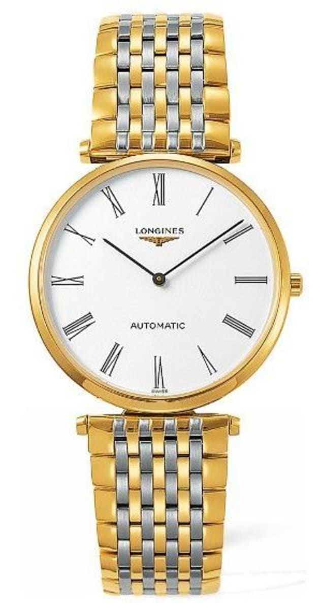 Brand New Longines La Grande Classique Automatic Men’s Watch Model L4.908.2.11.7. Gold PVD Stainless Steel case with Two-Tone Stainless Steel watch band. Folding clasp. Fixed bezel. White dial. Automatic Self Winding movement. Push In crown. Scratch Resistant Sapphire crystal. Case size: 36mm. Solid case back. 30 Meters – 100 Feet water resistant. Also known as model: L49082117, L4-908-2-11-7.
