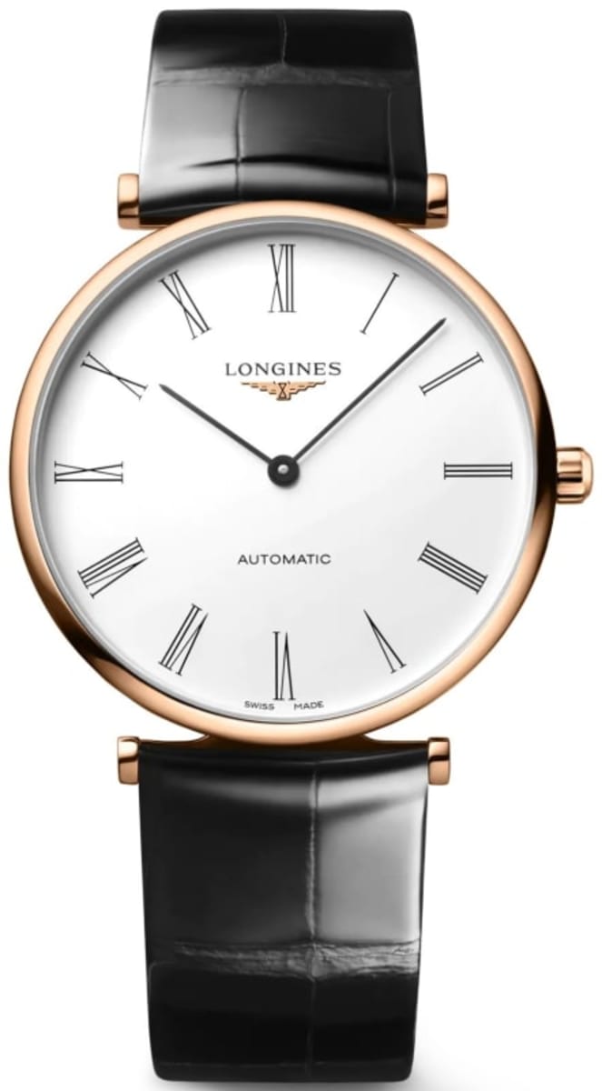Brand New Longines La Grande Classique Automatic White Dial Leather Strap Women’s Watch Model L4.918.1.91.2. Rose Gold PVD case with Black Alligator Leather strap. Tang clasp. Dial description: Black hands and Roman Numeral hour markers on a White dial. Automatic movement. Powered by Longines Caliber L591 engine with 45 hours power reserve. Watch functions: Hour, Minute. Scratch Resistant Sapphire crystal. Round case shape. Case size: 38mm. Case thickness: 8.10mm. Transparent case back (for illustration purposes only). 30 Meters – 100 Feet water resistant. Also known as model: L49181912.