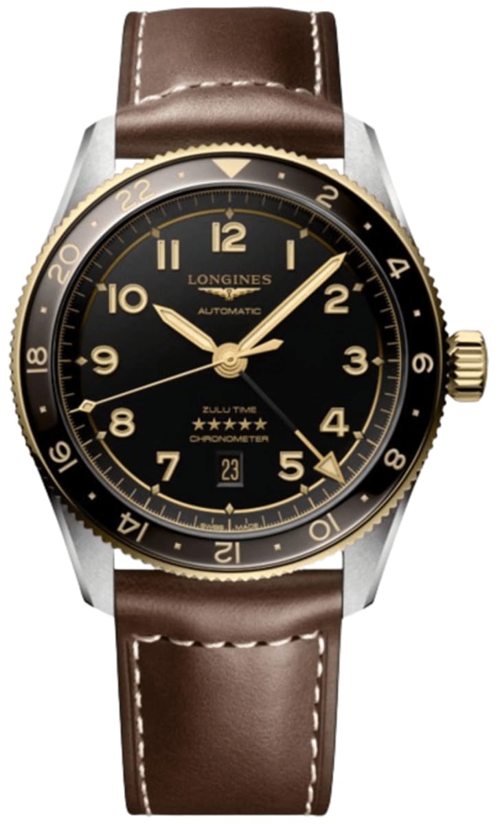 Longines Spirit Zulu Time Automatic GMT Black Dial 18K Yellow Gold Bezel Brown Leather Strap Men’s Watch L3.812.5.53.2 42mm