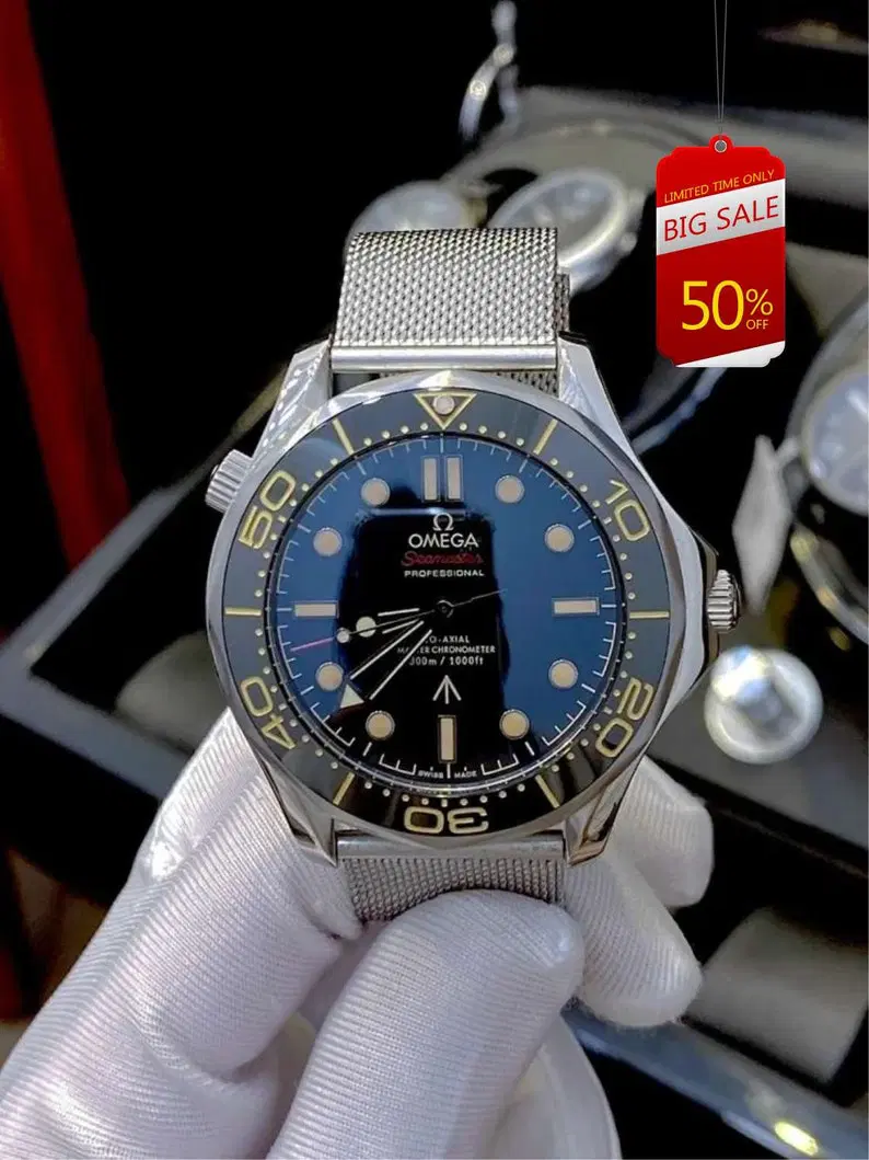 Parameters – Men’s Omega watchesDiameter: 41mmSurface thickness: 12mmShell and lock: Stainless steelStrap: stainless steel wireMachine: Japanese automatic muscleGlass face: Scratch -proof sapphireWaterproof: 5ATM