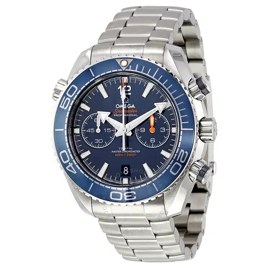 Stainless steel case with a stainless steel bracelet. Uni-directional rotating coin edge stainless steel bezel with a blue ceramic (count-up elapsed time) top ring. Blue dial with luminous silver-tone arrow-shaped hands and index hour markers. An Arabic numeral appears at the 12 o’clock position. Minute markers around the outer rim. Dial Type: Analog. Luminescent hands and markers. Date display at the 6 o’clock position. Chronograph – two sub-dials displaying: 60 seconds, and 12 hours. Omega calibre 9900 automatic movement, based upon Omega 9300, containing 54 Jewels, bitting at 28800 vph, and has a power reserve of approximately 60 hours. Scratch resistant sapphire crystal. Screw down crown. Transparent case back (for illustration purposes only). Round case shape. Case size: 45.5 mm. Case thickness: 18.87 mm. Band width: 22 mm. Deployment clasp with a double push button release. Water resistant at 600 meters / 2000 feet. Functions: chronograph, date, hour, minute, second, co-axial escapement, chronometer. Seamaster Planet Ocean Series. Dive watch style. Watch label: Swiss Made. Omega Seamaster Planet Ocean Chronograph Automatic Men’s Watch 215.30.46.51.03.001.