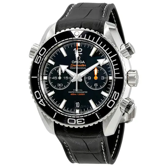 Stainless steel case with a black rubber strap with a (stiched) black (alligator) leather top. Uni-directional rotating stainless steel bezel with a black ceramic (count-up elapsed time) top ring. Black dial with luminous silver-tone arrow-shaped hands and index hour markers. An Arabic numeral appears at the 12 o’clock position. Minute markers around the outer rim. Dial Type: Analog. Luminescent hands and markers. Date display at the 6 o’clock position. Chronograph – two sub-dials displaying: 60 second and 12 hour. Omega calibre 9900 automatic movement, based upon Omega 9300, containing 54 Jewels, bitting at 28800 vph, and has a power reserve of approximately 60 hours. Scratch resistant sapphire crystal. Screw down crown. Transparent case back (for illustration purposes only). Round case shape. Case size: 45.5 mm. Case thickness: 18.87 mm. Band width: 22 mm. Deployment with push button release clasp. Water resistant at 600 meters / 2000 feet. Functions: chronograph, date, hour, minute, second, co-axial escapement, chronometer. Seamaster Planet Ocean Series. Luxury watch style. Watch label: Swiss Made. Omega Seamaster Planet Ocean Chronograph Automatic Men’s Watch 215.33.46.51.01.001.