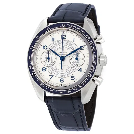 Stainless steel case with a blue (alligator) leather strap. Fixed stainless steel bezel with an inlaid blue aluminium ring showing tachymeter markings. Silver dial with blue hands and Arabic numeral hour markers. Telemeter markings and pulsometer scale around an inner ring. Minute markers. Minute markers around the outer rim. Dial Type: Analog. Chronograph – two sub-dials displaying: 60 second and 12 hour. Omega calibre 9908 hand wind movement. Scratch resistant sapphire crystal. Pull / Push crown. Transparent case back (for illustration purposes only). Round case shape. Case size: 43 mm. Band width: 21 mm. Water resistant at 50 meters / 165 feet. Functions: chronograph, hour, minute, second. Additional Info: original box, manual (complete accessories). Speedmaster Series. Luxury watch style. Watch label: Swiss Made. Omega Speedmaster Chronograph Hand Wind Silver Dial Men’s Watch 329.33.43.51.02.001.