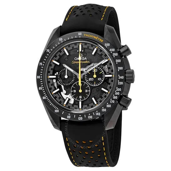 Bkack ceramic case with a black nylon strap. Fixed black ceramic bezel showing tachymeter markings. Skeleton dial with luminous grey hands and index hour markers. Minute markers around the outer rim. Dial Type: Analog. Luminescent hands and markers. Date display at the 6 o’clock position. Chronograph – two sub-dials displaying: 60 second and 24 hour. Omega calibre 1869 automatic movement with a 60-hour power reserve. Scratch resistant sapphire crystal. Pull / Push crown. Transparent case back (for illustration purposes only). Round case shape. Case size: 44.25 mm. Case thickness: 16.5 mm. Band width: 21 mm. Tang clasp. Water resistant at 50 meters / 165 feet. Functions: chronograph, date, hour, minute, second, chronometer, tachymeter. Luxury watch style. Watch label: Swiss Made. Omega Speedmaster “Dark Side of the Moon” Apollo 8 Chronograph Automatic Chronometer Men’s Watch 311.92.44.30.01.001.