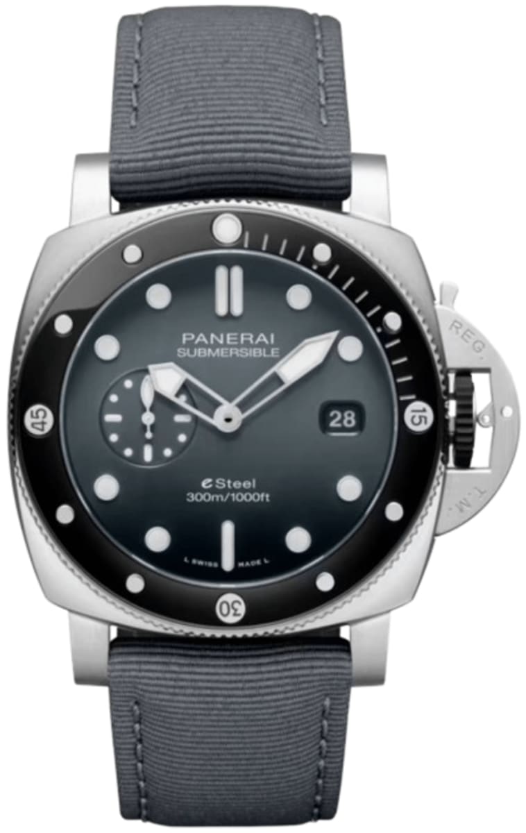 Brand New Panerai Submersible Quaranta Quattro Goldtech Grigio Roccia Automatic Grey Dial Synthetic Strap Men’s Luxury Watch Model PAM01288. Brushed eSteel case with Recycled PET Grey Strap . Brushed Stainless Steel Tang clasp. Unidirectional Rotating. Ceramic bezel. Dial description: Luminous Silver Tone Hands and Circle/Stick Hour Markers with One Sub-dial and the Date at 3 o’clock on a Anthracite Grey Dial. Swiss Automatic movement. Calendar: Date at 3 o’clock. Chronograph sub-dials display: Date, Seconds. Powered by Panerai Calibre P.900 engine with 72 hours power reserve. Watch functions: Date, Power Reserve, Hour, Minute, Second. Protected crown. Scratch Resistant Sapphire crystal. Cushion case shape. Case size: 44mm. Solid case back. 300 Meters – 990 Feet water resistant. Includes Secondary Black Caoutchouc Strap