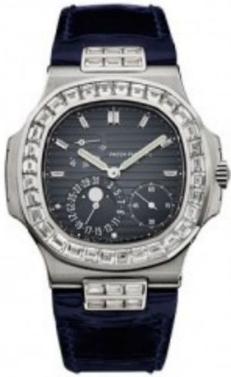 Brand New Patek Philippe Nautilus Men’s Watch Model 5724G-001. 18kt White Gold and Diamonds case with Alligator Leather strap. Deployment clasp. 18kt White Gold and Diamonds bezel. Blue dial. Automatic Self Winding With Power Reserve movement. Screwed Down crown. Scratch Resistant Sapphire crystal. Solid case back. 60 Meters – 200 Feet water resistant.