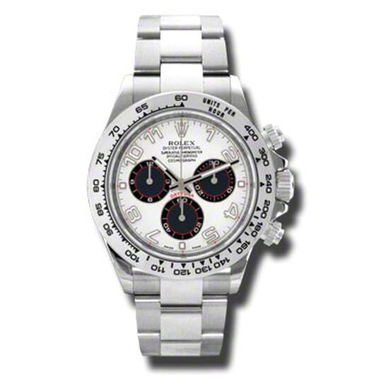 18kt white gold case with a white gold-tone 18kt white gold oyster bracelet. Fixed tachymeter scale 18kt white gold bezel. White dial with silver-tone hands and Arabic numeral hour markers. Minute markers around the outer rim. Dial Type: Analog. Luminescent hands. Chronograph – three sub-dials displaying: 60 second, 30 minute and 12 hour. Rolex Calibre 4130 Automatic movement, based upon Rolex 4030, containing 44 Jewels, bitting at 28800 vph, and has a power reserve of approximately 72 hours. Scratch resistant sapphire crystal. Screw down crown. Solid case back. Round case shape, case size: 40 mm. Oyster clasp. Water resistant at 100 meters / 330 feet. Functions: chronograph, hour, minute, second, chronometer. Cosmograph Daytona Series. Casual watch style. Watch label: Swiss Made. Rolex Cosmograph Daytona Automatic Men’s 18 Carat White Gold Oyster Watch 116509WAO.