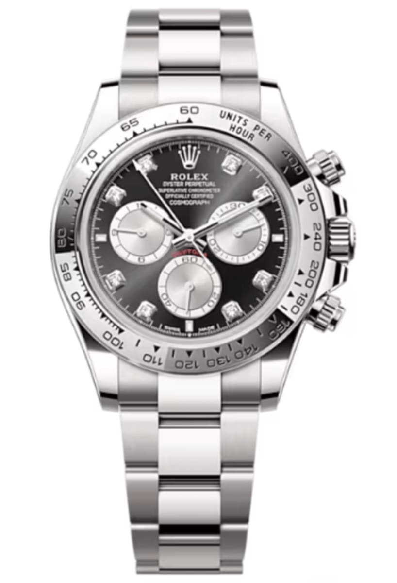 Brand New Rolex Cosmograph Daytona White Gold Black and Steel Diamond-Set Dial Men’s Luxury Watch Model M126509-0002. Brushed and Polished 18k White Gold. case with Brushed and Polished 18k White Gold Oyster Style Bracelet. watch band. Oysterclasp clasp. Fixed, with Engraved Tachymetric Scale, in 18k White Gold. bezel. Dial description: Luminescent 18k White Gold Hands and Diamond Hour Markers with 3 Sub-Dials; 30 Minute at 3 o’clock, 60 Second at 6 o’clock, and 12 Hour at 9 o’clock, Displayed on a Black and Steel Dial. dial. Perpetual, Mechanical Chronograph, Self-Winding. movement. Chronograph sub-dials display: 60 Second, 30 Minute, 12 Hours. Powered by Rolex Caliber 4131 engine with 72 hours power reserve. Watch functions: Power Reserve, Hour, Minute, Second, Chronograph, Speed. Screw-Down crown. Scratch Resistant Sapphire crystal. Round case shape. Case size: 40mm. Monobloc Middle Case, Screw-Down Case Back and Winding Crown.. 100 Meters – 330 Feet water resistant. New 2023 Model