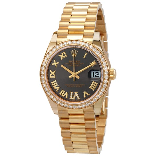 18kt yellow gold case with a 18kt yellow gold president bracelet. Fixed 18kt yellow gold bezel set with diamonds. Grey dial with yellow gold hands and Roman numeral hour markers. Diamond-set roman numeral appears at the 6 o’clock position. Dial Type: Analog. Date display at the 3 o’clock position. Rolex Calibre 2236 Automatic movement, based upon Rolex 2235, containing 31 Jewels, bitting at 28800 vph, and has a power reserve of approximately 55 hours. Scratch resistant sapphire crystal. Screw down crown. Solid case back. Round case shape, case size: 31 mm. Crown clasp. Water resistant at 100 meters / 330 feet. Functions: date, hour, minute, second, chronometer. Datejust 31 Series. Luxury watch style. Watch label: Swiss Made. Item Variations: m278288rbr-0026. Rolex Datejust 31 Automatic 18kt Diamond Grey Dial Ladies Watch 278288RRDP.