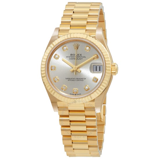 18kt yellow gold case with a 18kt yellow gold president bracelet. Fixed fluted 18kt yellow gold bezel. Silver dial with yellow gold hands and diamond hour markers. Dial Type: Analog. Date display at the 3 o’clock position. Rolex Calibre 2236 Automatic movement, based upon Rolex 2235, containing 31 Jewels, bitting at 28800 vph, and has a power reserve of approximately 55 hours. Scratch resistant sapphire crystal. Screw down crown. Solid case back. Round case shape, case size: 31 mm. Crown clasp. Water resistant at 100 meters / 330 feet. Functions: date, hour, minute, second, chronometer. Datejust 31 Series. Luxury watch style. Watch label: Swiss Made. Item Variations: M278278-0034. Rolex Datejust 31 Automatic 18kt Diamond Silver Dial Ladies Watch 278278SDP.