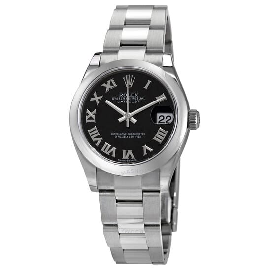 Stainless steel case with a stainless steel Rolex oyster bracelet. Fixed stainless steel bezel. Black dial with silver-tone hands and Roman numeral hour markers. Dial Type: Analog. Date display at the 3 o’clock position. Rolex calibre 2236 automatic movement, based upon Rolex 2235, containing 31 Jewels, bitting at 28800 vph, and has a power reserve of approximately 55 hours. Scratch resistant sapphire crystal. Screw down crown. Screw down case back. Round case shape. Case size: 31 mm. Fold over clasp. Water resistant at 100 meters / 330 feet. Functions: date, hour, minute, second. Datejust 31 Series. Luxury watch style. Watch label: Swiss Made. Rolex Datejust 31 Automatic Black Dial Ladies Watch 278240BKRO.
