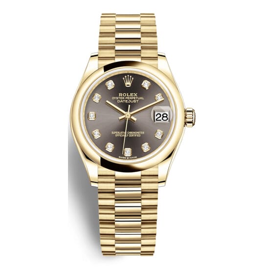 18kt yellow gold case with a 18kt yellow gold rolex president bracelet. Fixed 18kt yellow gold bezel. Dark grey dial with gold-tone hands and diamond hour markers. Dial Type: Analog. Date display at the 3 o’clock position. Rolex Calibre 2236 Automatic movement, based upon Rolex 2235, containing 31 Jewels, bitting at 28800 vph, and has a power reserve of approximately 55 hours. Scratch resistant sapphire crystal. Screw down crown. Solid case back. Round case shape. Case size: 31 mm. Water resistant at 100 meters / 330 feet. Functions: date, hour, minute, second. Luxury watch style. Watch label: Swiss Made. Rolex Datejust 31 Dark Grey Dial Automatic Ladies 18kt President Watch 278248GYDP.