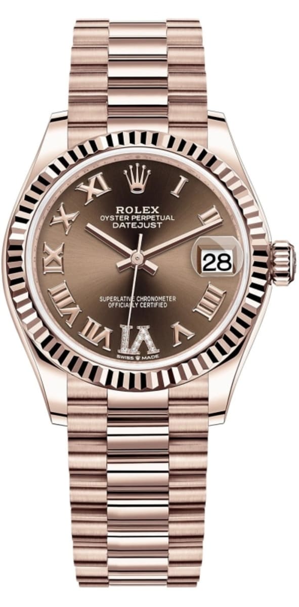 Brand New Rolex Datejust 31 Everose Gold Chocolate Diamond Pave Roman Dial Women’s Luxury Watch Model M278275-0025. Polished 18Kt Everose Gold case with 18kt Everose Gold President Style Bracelet. watch band. Oysterclasp clasp. Fixed-Fluted bezel. Dial description: Polished Rose Gold Hands and Roman Numeral Hour Markers and a Diamond Pave VI With the Date at 3 o’clock, on a Chocolate Dial. dial. Automatic – Chronometer movement. Powered by Rolex Calibre 2236 engine with 55 hours power reserve. Watch functions: Date, Power Reserve, Hour, Minute, Second. Screw in crown. Scratch Resistant Sapphire crystal. Round case shape. Case size: 31mm. Solid case back. 100 Meters – 330 Feet water resistant.