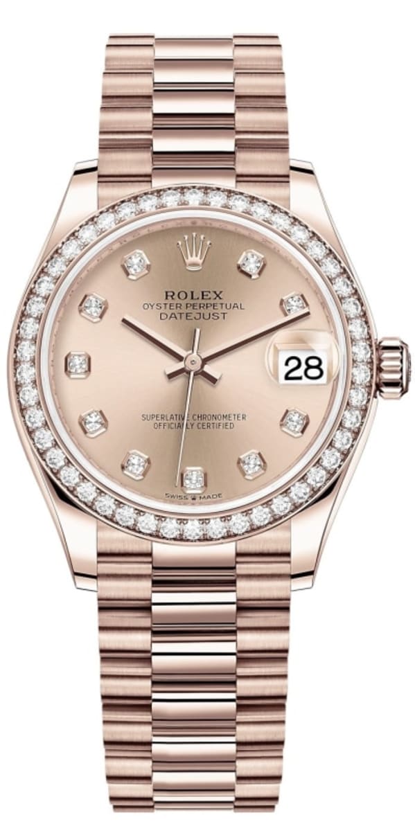 Brand New Rolex Datejust 31 Everose Gold Rose Diamond Dial Diamond Bezel Women’s Luxury Watch Model M278285RBR-0025. Polished 18Kt Everose Gold case with 18kt Everose Gold President Style Bracelet. watch band. Oysterclasp clasp. Fixed- Diamond-Set bezel. Dial description: Polished Rose Gold Hands and Diamond Hour Markers With the Date at 3 o’clock, on a Rose Dial. dial. Automatic – Chronometer movement. Powered by Rolex Calibre 2236 engine with 55 hours power reserve. Watch functions: Date, Power Reserve, Hour, Minute, Second. Screw in crown. Scratch Resistant Sapphire crystal. Round case shape. Case size: 31mm. Solid case back. 100 Meters – 330 Feet water resistant.