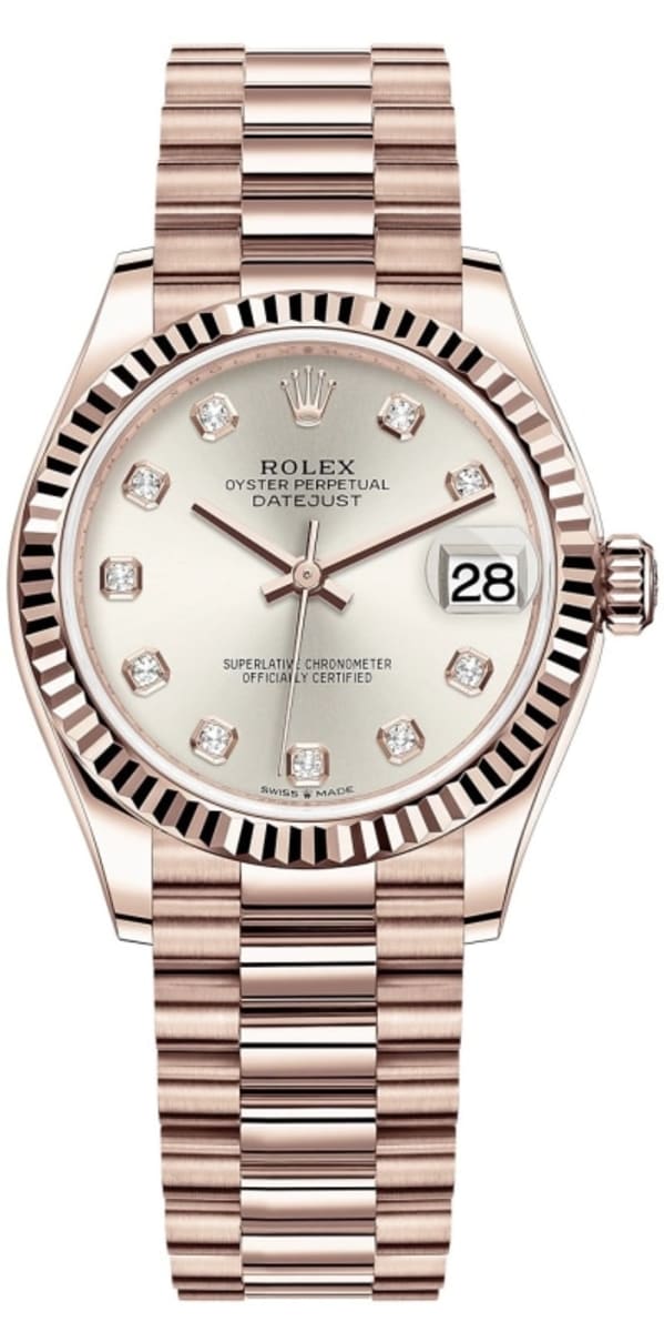 Brand New Rolex Datejust 31 Everose Gold Silver Diamond Dial Women’s Luxury Watch Model M278275-0039. Polished 18Kt Everose Gold case with 18kt Everose Gold President Style Bracelet. watch band. Oysterclasp clasp. Fixed-Fluted bezel. Dial description: Polished Rose Gold Hands and Diamond Hour Markers With the Date at 3 o’clock, on a Silver Dial. dial. Automatic – Chronometer movement. Powered by Rolex Calibre 2236 engine with 55 hours power reserve. Watch functions: Date, Power Reserve, Hour, Minute, Second. Screw in crown. Scratch Resistant Sapphire crystal. Round case shape. Case size: 31mm. Solid case back. 100 Meters – 330 Feet water resistant.