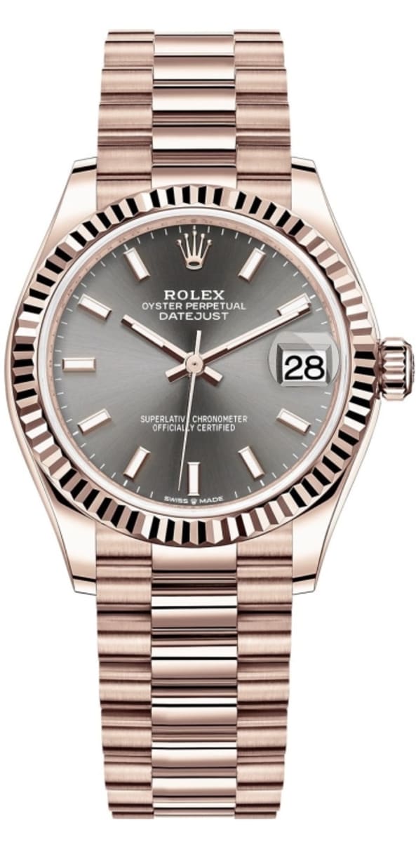 Brand New Rolex Datejust 31 Everose Gold Slate Dial Women’s Luxury Watch Model M278275-0027. Polished 18Kt Everose Gold case with 18kt Everose Gold President Style Bracelet. watch band. Oysterclasp clasp. Fixed-Fluted bezel. Dial description: Luminous Stick Hour Markers and Polished Rose Gold Hands With the Date at 3 o’clock, on a Slate Dial. dial. Automatic – Chronometer movement. Powered by Rolex Calibre 2236 engine with 55 hours power reserve. Watch functions: Date, Power Reserve, Hour, Minute, Second. Screw in crown. Scratch Resistant Sapphire crystal. Round case shape. Case size: 31mm. Solid case back. 100 Meters – 330 Feet water resistant.