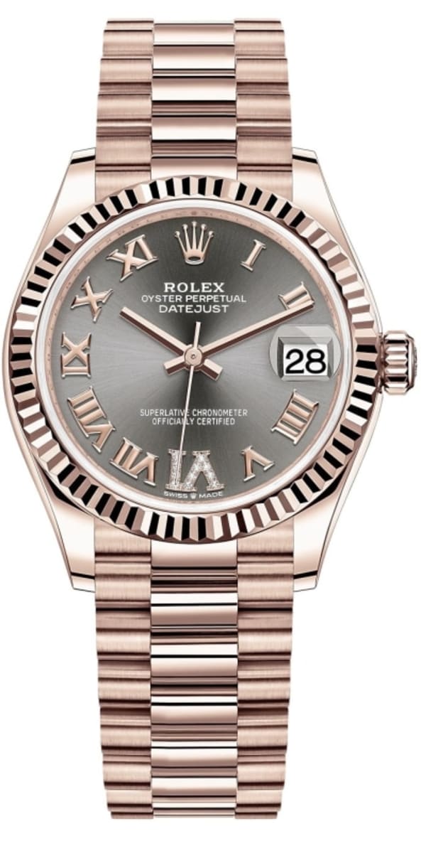 Brand New Rolex Datejust 31 Everose Gold Slate Diamond Pave Roman Dial Women’s Luxury Watch Model M278275-0033. Polished 18Kt Everose Gold case with 18kt Everose Gold President Style Bracelet. watch band. Oysterclasp clasp. Fixed-Fluted bezel. Dial description: Polished Rose Gold Hands and Roman Numeral Hour Markers and a Diamond Pave VI With the Date at 3 o’clock, on a Slate Dial. dial. Automatic – Chronometer movement. Powered by Rolex Calibre 2236 engine with 55 hours power reserve. Watch functions: Date, Power Reserve, Hour, Minute, Second. Screw in crown. Scratch Resistant Sapphire crystal. Round case shape. Case size: 31mm. Solid case back. 100 Meters – 330 Feet water resistant.