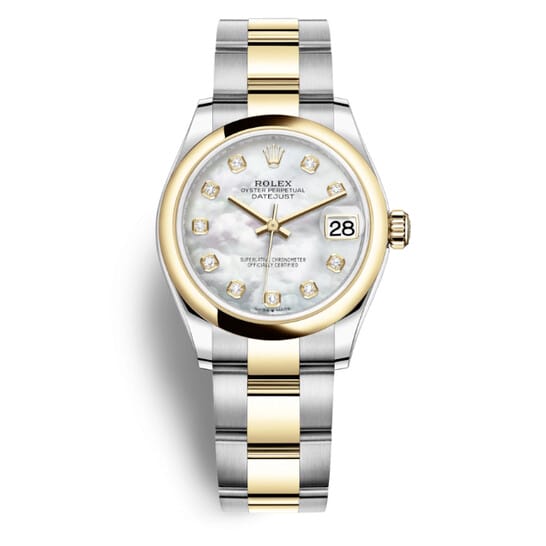 Stainless steel and 18kt yellow gold case with a steel and 18kt yellow gold oyster bracelet. Fixed 18kt yellow gold bezel. Mother of pearl dial with gold-tone hands and diamond hour markers. Dial Type: Analog. Date display at the 3 o’clock position. Rolex Calibre 2236 Automatic movement, based upon Rolex 2235, containing 31 Jewels, bitting at 28800 vph, and has a power reserve of approximately 55 hours. Scratch resistant sapphire crystal. Screw down crown. Solid case back. Round case shape. Case size: 31 mm. Folding clasp. Water resistant at 100 meters / 330 feet. Functions: date, hour, minute, second. Luxury watch style. Watch label: Swiss Made. Rolex Datejust 31 Mother of Pearl Diamond Dial Ladies Steel and 18kt Jubilee Watch 278243MDO.