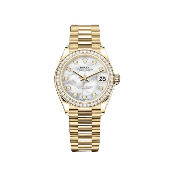 18kt yellow gold case with a 18kt yellow gold rolex president bracelet. Fixed-diamond set bezel. Mother of pearl dial with yellow gold hands and diamond hour markers. Dial Type: Analog. Date display at the 3 o’clock position. Rolex Calibre 2236 automatic movement with a 55-hour power reserve. Scratch resistant sapphire crystal. Screw down crown. Solid case back. Round case shape. Case size: 31 mm. Water resistant at 100 meters / 330 feet. Functions: date, hour, minute, second. Luxury watch style. Watch label: Swiss Made. Rolex Datejust 31 Mother of Pearl Diamond Ladies 18kt President Watch 278288MDP.