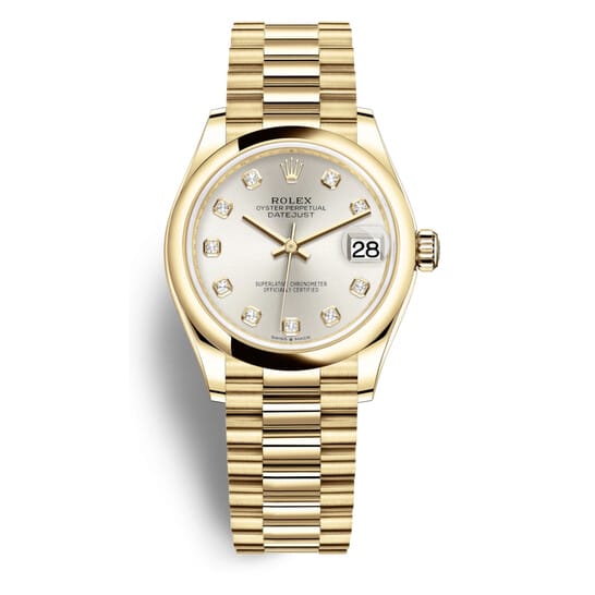 18kt yellow gold case with a 18kt yellow gold rolex president bracelet. Fixed 18kt yellow gold bezel. Silver dial with gold-tone hands and diamond hour markers. Dial Type: Analog. Date display at the 3 o’clock position. Rolex Calibre 2236 Automatic movement, based upon Rolex 2235, containing 31 Jewels, bitting at 28800 vph, and has a power reserve of approximately 55 hours. Scratch resistant sapphire crystal. Screw down crown. Solid case back. Round case shape. Case size: 31 mm. Water resistant at 100 meters / 330 feet. Functions: date, hour, minute, second. Luxury watch style. Watch label: Swiss Made. Rolex Datejust 31 Silver Diamond Dial Automatic Ladies 18kt Oyster Watch 278248SDP.