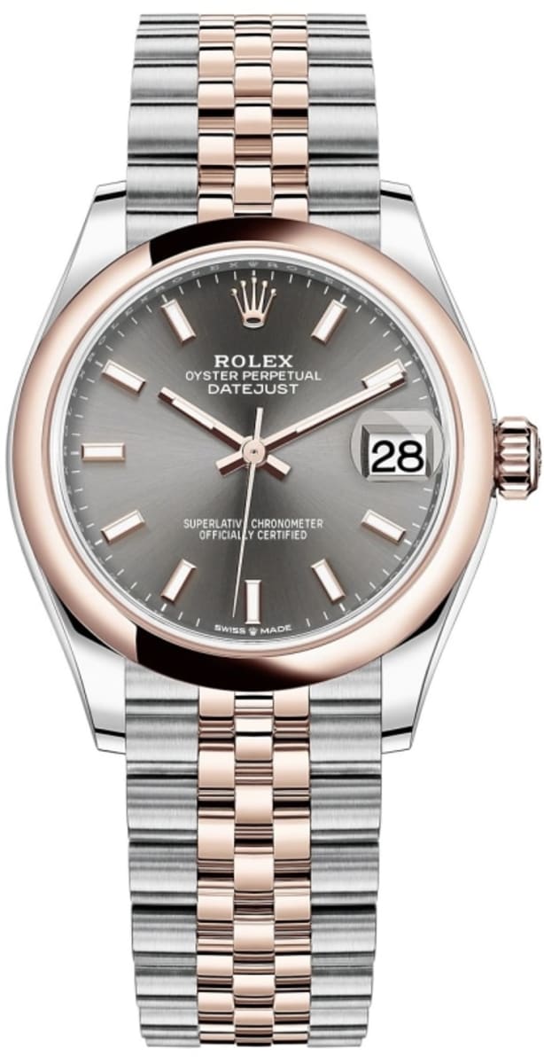 Brand New Rolex Datejust 31 Slate Dial Women’s Luxury Watch Model M278241-0018. Polished 18kt Everose Gold and Stainless Steel. case with 18kt Everose Gold and Stainless Steel Jubilee Style Bracelet. watch band. Crownclasp clasp. Fixed-Domed bezel. Dial description: Polished Rose Gold Hands With Stick Hour Markers and the Date Displayed on a Slate Dial. dial. Automatic – Chronometer movement. Powered by Rolex Calibre 2236 engine with 55 hours power reserve. Watch functions: Date, Power Reserve, Hour, Minute, Second. Screw in crown. Scratch Resistant Sapphire crystal. Round case shape. Case size: 31mm. Solid case back. 100 Meters – 330 Feet water resistant.