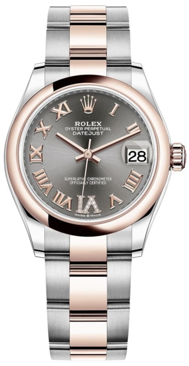 Brand New Rolex Datejust 31 Slate Pave Roman Dial Women’s Luxury Watch Model M278241-0029. Polished 18kt Everose Gold and Stainless Steel. case with 18kt Everose Gold and Stainless Steel Oyster Style Bracelet. watch band. Crownclasp clasp. Fixed-Domed bezel. Dial description: Polished Rose Gold Hands With Roman Numeral Hour Markers and a Pave Diamond at the VI hour marker and the Date Displayed on a Slate Dial. dial. Automatic – Chronometer movement. Powered by Rolex Calibre 2236 engine with 55 hours power reserve. Watch functions: Date, Power Reserve, Hour, Minute, Second. Screw in crown. Scratch Resistant Sapphire crystal. Round case shape. Case size: 31mm. Solid case back. 100 Meters – 330 Feet water resistant.