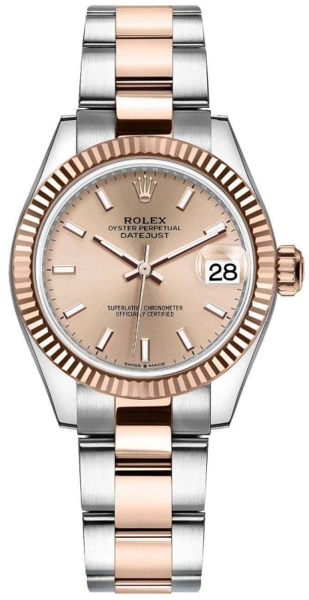 Brand New Rolex Datejust 31 Stainless Steel and Rose Gold Rose Dial Women’s Luxury Watch Model M278271-0009. Polished 18kt Rose Gold and Stainless Steel. case with 18kt Rose Gold and Stainless Steel Oyster Style Bracelet watch band. Crownclasp clasp. Fixed-Fluted bezel. Dial description: Luminous Hands and Stick Hour Markers With the Date at 3 o’clock, on a Rose Dial. dial. Automatic – Chronometer movement. Powered by Rolex Calibre 2236 engine with 55 hours power reserve. Watch functions: Date, Power Reserve, Hour, Minute, Second. Screw in crown. Scratch Resistant Sapphire crystal. Round case shape. Case size: 31mm. Solid case back. 100 Meters – 330 Feet water resistant.