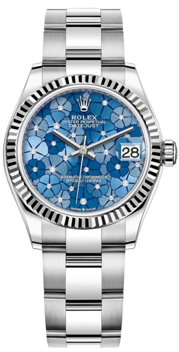 Rolex Datejust 31 Stainless Steel and White Gold Azzuro-Blue-Floral-Motif Diamond Dial Women’s Watch M278274-0035 31mm