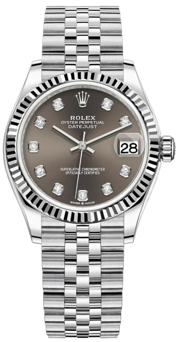 Brand New Rolex Datejust 31 Stainless Steel and White Gold Dark Grey Diamond Dial Women’s Luxury Watch Model m278274-0008. Polished White Gold and Stainless Steel. case with White Gold and Stainless Steel Jubilee Style Bracelet. watch band. Crownclasp clasp. Fixed-Fluted bezel. Dial description: Polished Silver Hands and Roman Numeral Hour Markers and the Date Displayed on a Dark Grey Dial. dial. Automatic – Chronometer movement. Powered by Rolex Calibre 2236 engine with 55 hours power reserve. Watch functions: Date, Power Reserve, Hour, Minute, Second. Screw in crown. Scratch Resistant Sapphire crystal. Round case shape. Case size: 31mm. Solid case back. 100 Meters – 330 Feet water resistant.