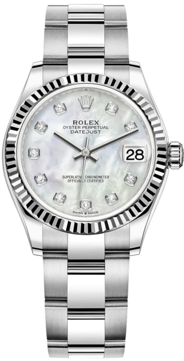 Brand New Rolex Datejust 31 Stainless Steel and White Gold Mother-of-Pearl Diamond Dial Women’s Luxury Watch Model M278274-0005. Polished White Gold and Stainless Steel. case with White Gold and Stainless Steel Oyster Style Bracelet. watch band. Crownclasp clasp. Fixed-Fluted bezel. Dial description: Polished Silver Hands and Roman Numeral Hour Markers and the Date Displayed on a Mother-of-Pearl Dial. dial. Automatic – Chronometer movement. Powered by Rolex Calibre 2236 engine with 55 hours power reserve. Watch functions: Date, Power Reserve, Hour, Minute, Second. Screw in crown. Scratch Resistant Sapphire crystal. Round case shape. Case size: 31mm. Solid case back. 100 Meters – 330 Feet water resistant.