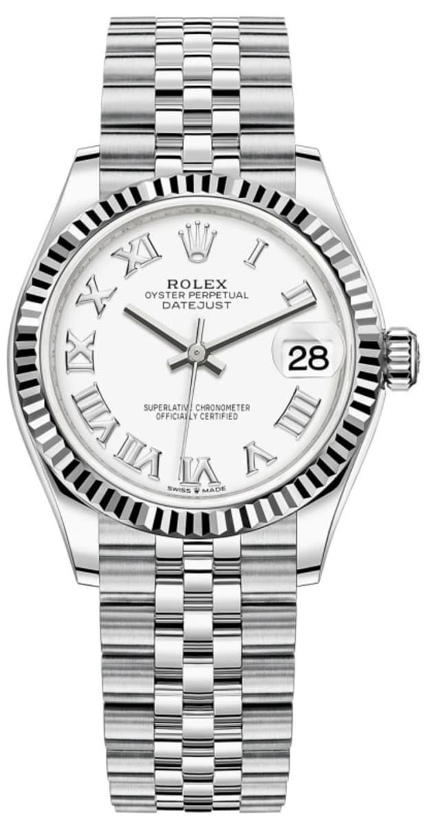 Brand New Rolex Datejust 31 Stainless Steel and White Gold White Roman Dial Women’s Luxury Watch Model M278274-0010. Polished White Gold and Stainless Steel. case with White Gold and Stainless Steel Jubilee Style Bracelet. watch band. Crownclasp clasp. Fixed-Fluted bezel. Dial description: Polished Silver Hands and Roman Numeral Hour Markers and the Date Displayed on a White Dial. dial. Automatic – Chronometer movement. Powered by Rolex Calibre 2236 engine with 55 hours power reserve. Watch functions: Date, Power Reserve, Hour, Minute, Second. Screw in crown. Scratch Resistant Sapphire crystal. Round case shape. Case size: 31mm. Solid case back. 100 Meters – 330 Feet water resistant.