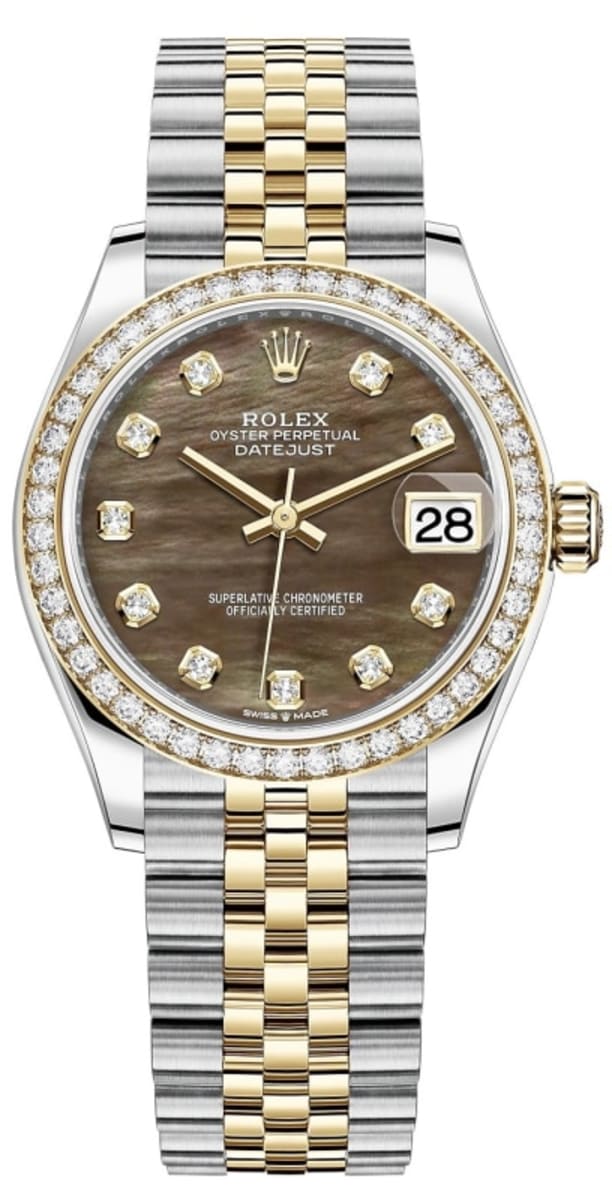 Brand New Rolex Datejust 31 Stainless Steel and Black Mother of Pearl Diamond Dial Diamond Bezel Women’s Luxury Watch Model M278383RBR-0024. Yellow Rolesor Case (combination of Oystersteel and ) case with and Stainless Steel Jubilee Style Bracelet. watch band. Crownclasp clasp. Fixed Set with Diamonds bezel. Dial description: Polished Hands and Diamond Hour Markers and the Date Displayed on a Black Mother of Pearl Dial. dial. Automatic movement. 55 hours power reserve. Watch functions: Date, Power Reserve, Hour, Minute, Second. Screw In crown. Scratch Resistant Sapphire crystal. Round case shape. Case size: 31mm. Solid case back. 100 Meters – 330 Feet water resistant.