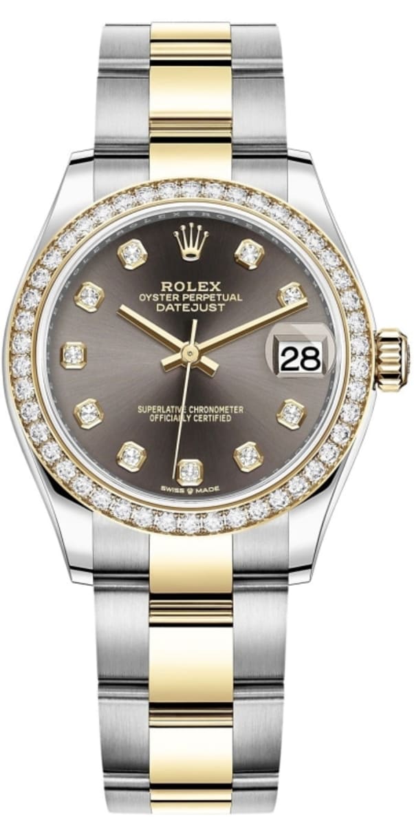 Brand New Rolex Datejust 31 Stainless Steel and Dark Grey Diamond Dial Diamond Bezel Women’s Luxury Watch Model M278383RBR-0021. Yellow Rolesor Case (combination of Oystersteel and ) case with and Stainless Steel Oyster Style Bracelet. watch band. Crownclasp clasp. Fixed Set with Diamonds bezel. Dial description: Polished Hands and Diamond Hour Markers and the Date Displayed on a Dark Grey Dial. dial. Automatic movement. 55 hours power reserve. Watch functions: Date, Power Reserve, Hour, Minute, Second. Screw In crown. Scratch Resistant Sapphire crystal. Round case shape. Case size: 31mm. Solid case back. 100 Meters – 330 Feet water resistant.