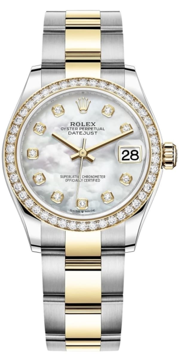 Brand New Rolex Datejust 31 Stainless Steel and Mother of Pearl Diamond Dial Diamond Bezel Women’s Luxury Watch Model M278383RBR-0027. Yellow Rolesor Case (combination of Oystersteel and ) case with and Stainless Steel Oyster Style Bracelet. watch band. Crownclasp clasp. Fixed Set with Diamonds bezel. Dial description: Polished Hands and Diamond Hour Markers and the Date Displayed on a Mother of Pearl Dial. dial. Automatic movement. 55 hours power reserve. Watch functions: Date, Power Reserve, Hour, Minute, Second. Screw In crown. Scratch Resistant Sapphire crystal. Round case shape. Case size: 31mm. Solid case back. 100 Meters – 330 Feet water resistant.