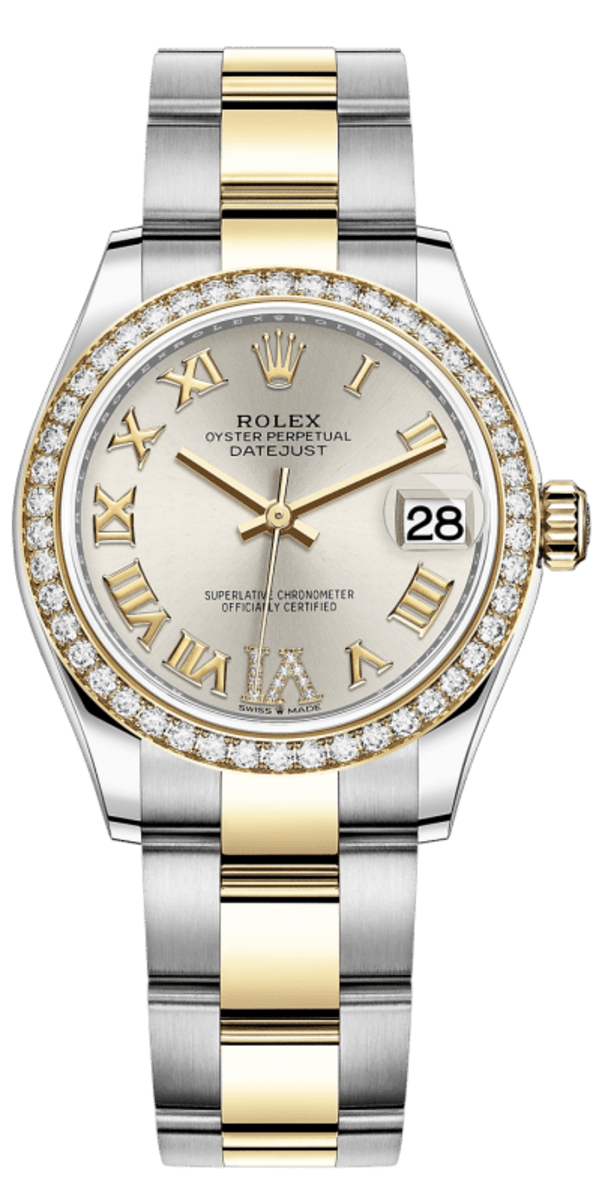 Brand New Rolex Datejust 31 Stainless Steel and Silver Pave Roman Dial Diamond Bezel Women’s Luxury Watch Model M278383RBR-0003. Yellow Rolesor Case (combination of Oystersteel and ) case with and Stainless Steel Oyster Style Bracelet. watch band. Crownclasp clasp. Fixed Set with Diamonds bezel. Dial description: Tone Hands and Roman Numeral Hour Markers, Paved Set VI Hour Marker. The Date Displayed at 3, on a Silver Dial. dial. Automatic movement. 55 hours power reserve. Watch functions: Date, Power Reserve, Hour, Minute, Second. Screw In crown. Scratch Resistant Sapphire crystal. Round case shape. Case size: 31mm. Solid case back. 100 Meters – 330 Feet water resistant.