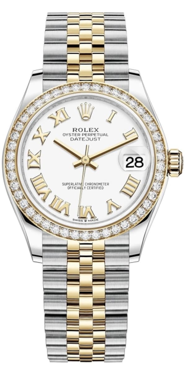 Brand New Rolex Datejust 31 Stainless Steel and White Roman Dial Diamond Bezel Women’s Luxury Watch Model M278383RBR-0002. Yellow Rolesor Case (combination of Oystersteel and ) case with and Stainless Steel Jubilee Style Bracelet. watch band. Crownclasp clasp. Fixed Set with Diamonds bezel. Dial description: Polished Hands and Roman Numeral Hour Markers and the Date Displayed on a White Dial. dial. Automatic movement. 55 hours power reserve. Watch functions: Date, Power Reserve, Hour, Minute, Second. Screw In crown. Scratch Resistant Sapphire crystal. Round case shape. Case size: 31mm. Solid case back. 100 Meters – 330 Feet water resistant.